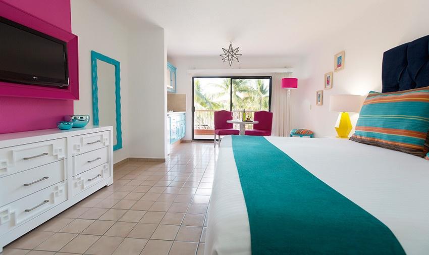 Enjoy our Junior Suite at Five-Star All-Inclusive Beach Resort & Spa Puerto Vallarta, which features fresh colors and rich materials designed to help you relax and revel in the bliss of being on a Puerto Vallarta all-inclusive vacation. Your choice of one king-sized bed or two double beds makes this the perfect option for a couple’s retreat or a small family getaway. The spacious bathroom with travertine marble décor and the fully equipped kitchenette allows for the greatest convenience and comfort. There is also a dining area for 2 and a balcony with an ocean or garden view equipped with patio furniture.